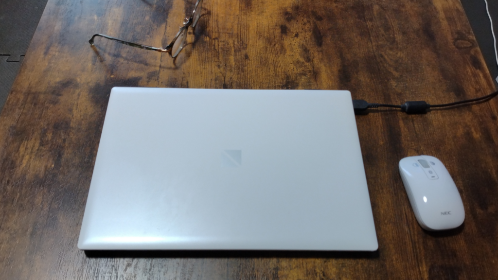 自宅のテーブルにノートパソコンを置いた、シンプルなスタイルです。
